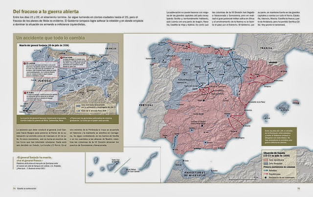 El 18 de julio el general Francisco Franco se pronunció en las islas Canarias, y el movimiento se extendió a la península. Los rebeldes se autodenominaron "nacionales"; triunfaron en Andalucía, Galicia y Castilla la vieja; mientras que los "republicanos" o "leales", retuvieron el poder en Madrid, Barcelona y Bilbao (los crentos urbanos más grandes del país). Los planes iniciales de los sublevados se frustraron por la actitud del general José Miaja, el teniente coronel Vidente Rojo y de otros oficiales que permanecieron leales a la legalidad; pero también por la enérgica y heroica reacción de los partidarios de izquierda y de los sindiatos, que se armaron en improvisadas milicias que contribuyeron activamente a reprimir el alzamiento, no obstante la indecisión inicial del gobierno republicano.